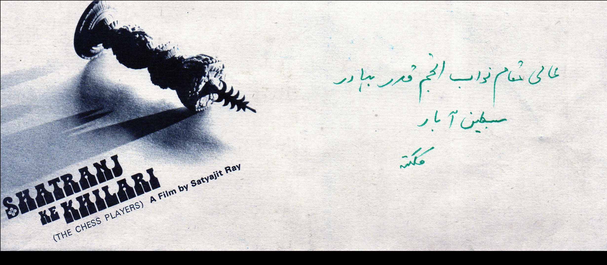 My dear Mr. Ray, After seeing the full length preview of 'Shatranj-ke-Khilari' this morning, I must admit our apprehensions that my illustrious fore-bear may not after all get fair treatment were completely removed. Because of this I had not asked you to publicise our co-operation with your production as that would have shown approval of Wajid Ali's present survivors, and brought us into disrepute in our social circles in Lucknow. But there is no such fear now. And I intend writing an article in approbation and publishing the same to clear misapprehension from the minds of Shia Muslim public about your picture. I must congratulate you for the splendid presentation and correct history and culture of the period. And I am particularly thankful to you for exposing the breach of faith by the britishers in a subtle and suave manner in his gobbling up the last 'cherry' that was Oudh. Malka Kishawar had even offered replacement of her son Wajid Ali by the genuine reason and not a pretext. However, in my humble opinion, since the masses of India can't fully appreciate the subtleties and nuances you have depicted, you might consider (after the international award shows depicted) to insert and one or two more dances and haunting song of that period in order to make your great artistic picture commercial success as well. This can still be done, say by a flash back of Mirza's (Sanjeev's) life at the Baiji's 'Kotha' before his addiction to chess, as mention in the dialogues Shabana and Sanjeev and a 'Bhaand's nautch' show somewhere, which in itself will create a sensational interest amongst the Indian masses, who have heared a lot about Bhaands' but have never seen. There is, I believed, still an excellent Kashmiri Bhand's party in Lucknow. As an amateur, and well wisher, I have only given this as a suggestion. With regards, I am, Yours sincerely, Anjum Quder |