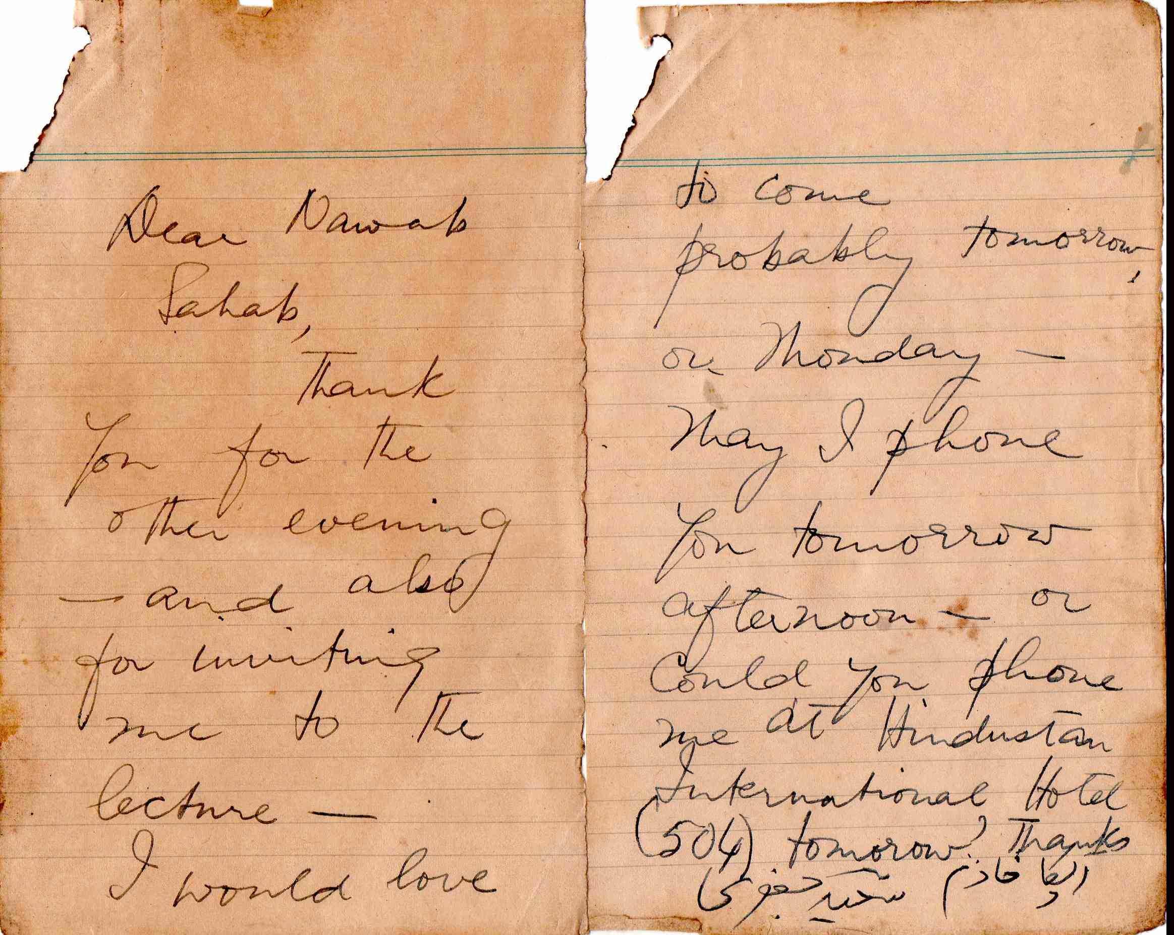 (Roman Hindi) Qayam:(Place) Hindustan International Hotel 5.5.1977 Waqt: (Time) Shaam (Evening) 8 p.m. Mohtaram Ahtamam Janab Nawab Sahab MuddayZu Jallalahoo ! Assalam - Alaikum !! Aap ki Inayat aur Mohabbat ka Taqaza to yeh tha ke hum sab aapki khidmat-e-Aqdus mein hazir ho jaate, magar achanak ek programme ban gaya aur aaj raat Hindustan International Hotel mein hamari Unit ki jaanib se party di ja rahi hai. Janabe-Aali sey nehaiti modaybana darkhwast hai ke aaj sham iss party mein tashreef layen aur mein hi nahi tamam log aap ki izzat afzai farmayein ge. Yeh darkhwast meri nahi balkey JINDAL sahib aur RAY sahib ki bhi hai Neyaz Mand Sd/- Javed |